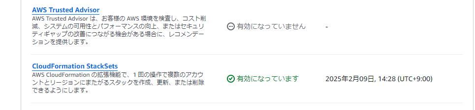 SERVICE_MANAGEDモードを使うには、AWS OrganizationsでCloudFormation Stacksetsの信頼されたアクセスを有効化しておく必要がある。管理側のアカウントのマネジメントコンソールで、AWS Organizations→サービスで、「CloudFormation Stacksets」を有効化しておく。