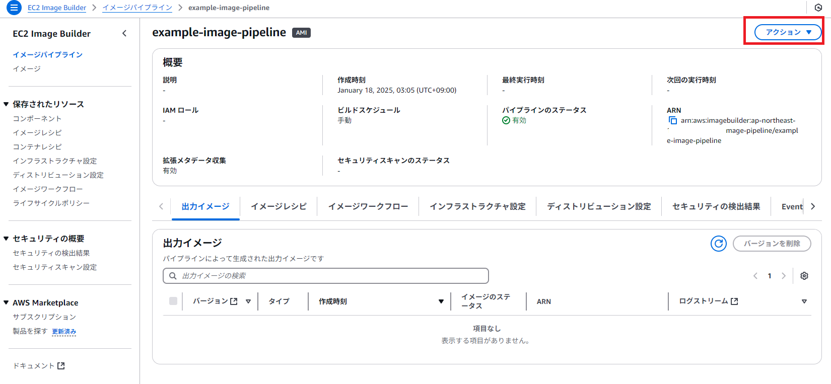 EC2 Image Builderの「イメージパイプライン」から、「アクション」→「パイプラインを実行」