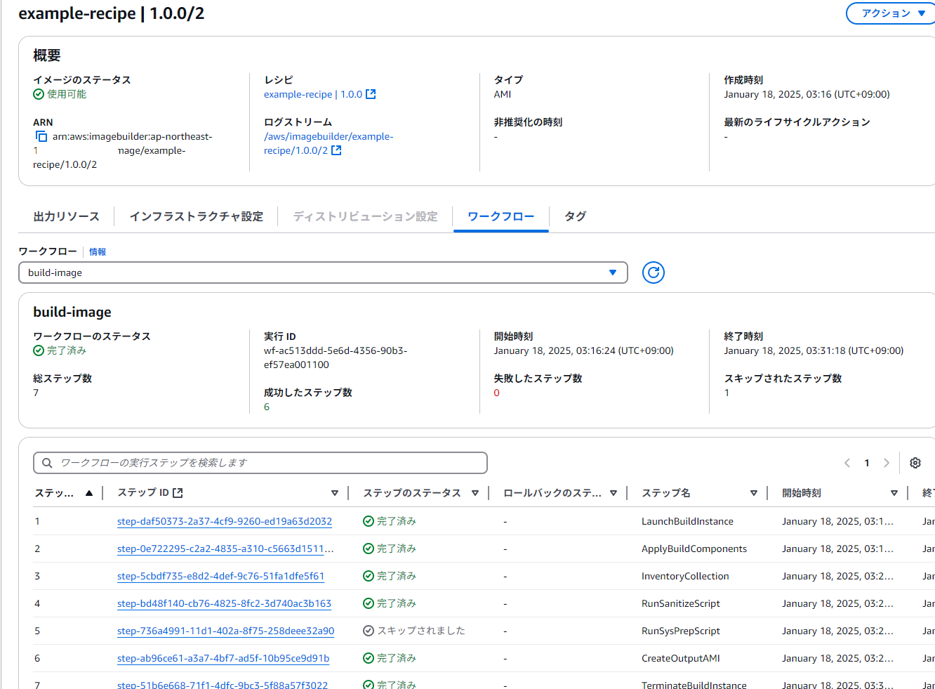 イメージを見ると途中経過が表示される。まあまあ時間がかかる(15分ぐらい)。特にエラーなければ全部完了済みになっているはず。ロールにポリシーが付与されていないとハマるとここが失敗することがある。