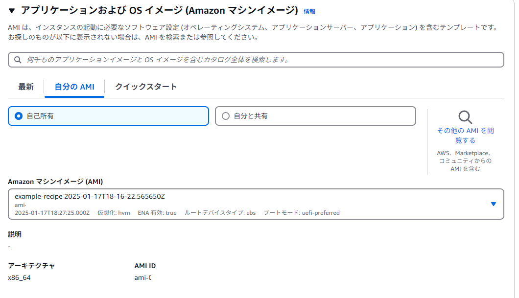 作ったAMIを使いたいときは、EC2の起動画面から「自分のAMI」で表示される。