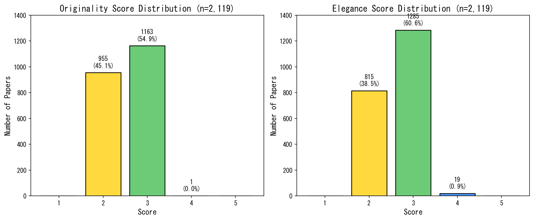 LLMは「普通のトップカンファレンス論文」に3を、「やや弱め」に2を付ける傾向があります。プロンプトで「3がデフォルト」と指示した通りの挙動です。