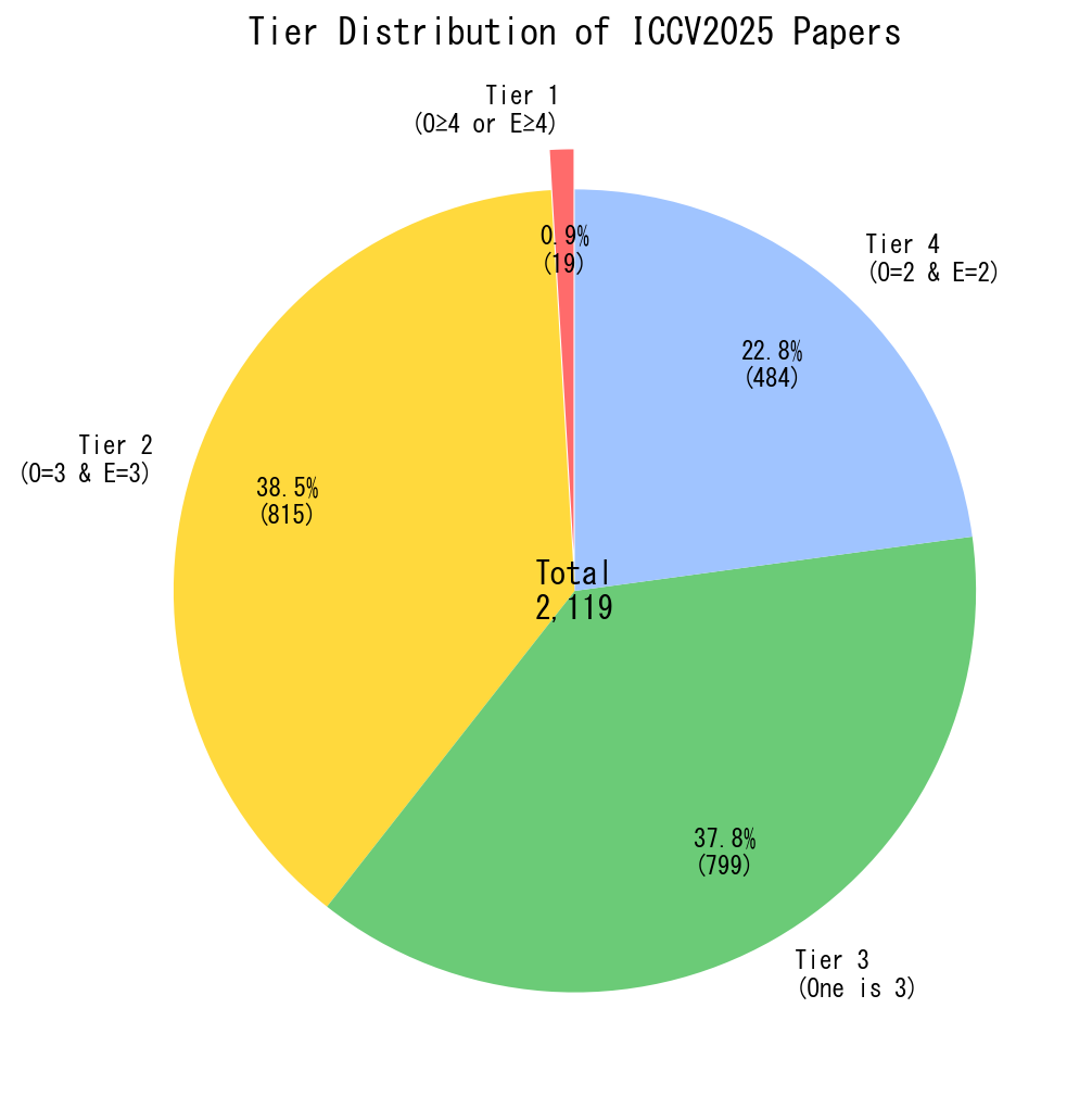 ICCV2025の高品質論文(Originality/Elegance評価上位200件)は12のトピックに分類され、以下の3つの主要な研究領域が顕著です:
