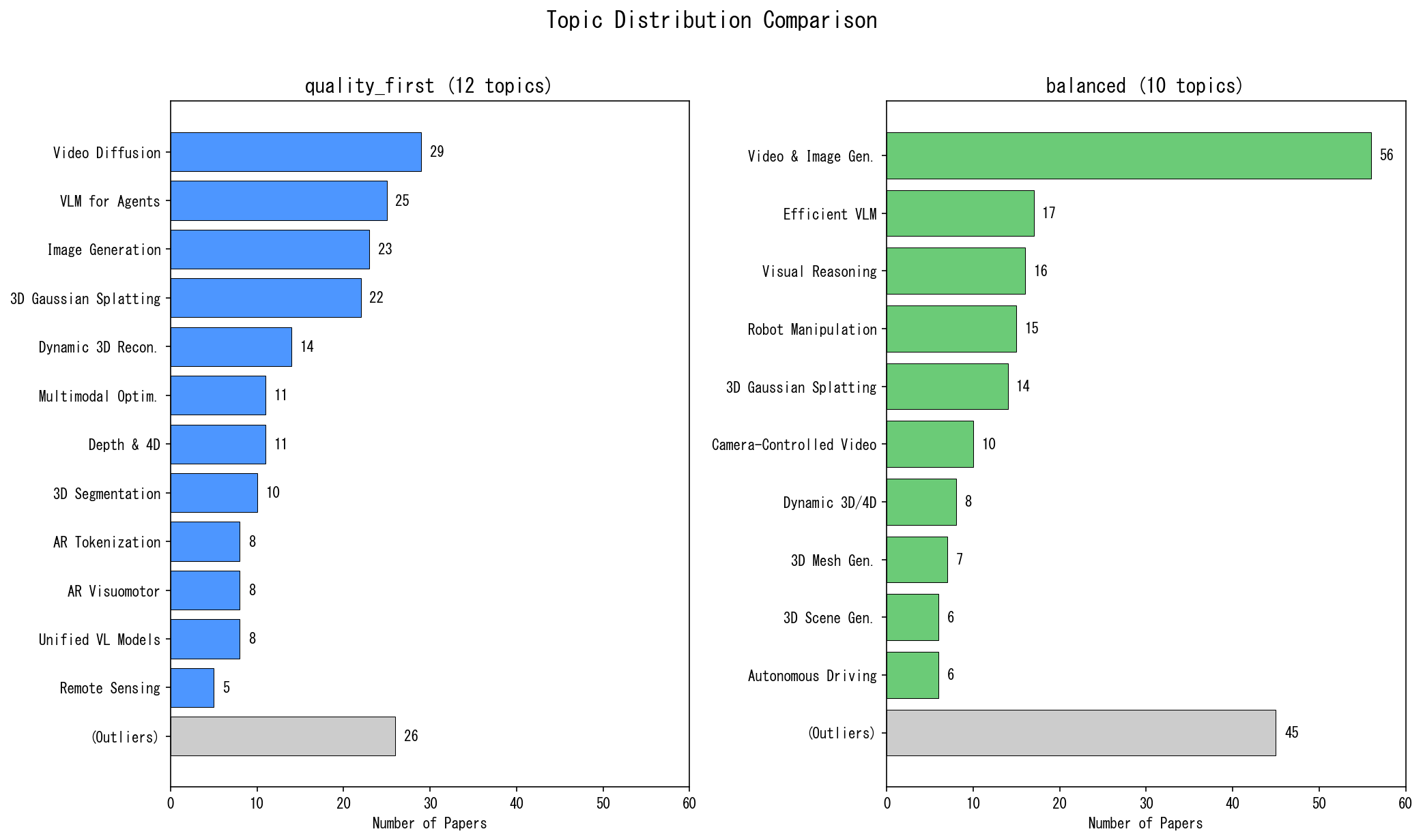 quality_first ではTier 1-2のみなので、「革新的手法」同士が細かく分離されます。Video Diffusion と Image Generation が別トピックになり、Autoregressive 系も2つに分かれます。
