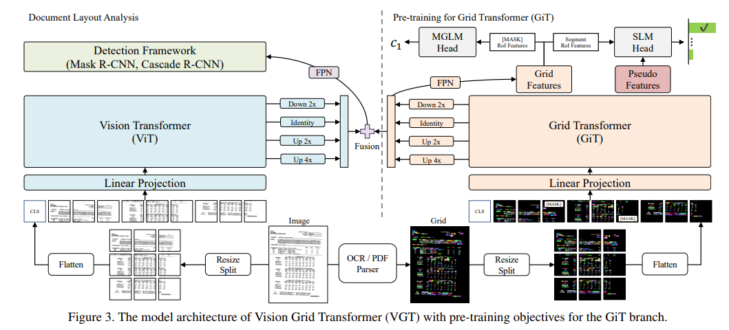 VGTは、画像をViTで処理し、OCR結果をグリッド形式に変換してGiTで処理する2ストリームモデルです。GiTは、BERTのようにマスクされたトークンを予測するMGLMと、LayoutLMで生成された疑似特徴とセグメント特徴を整合させるSLMによって事前学習されます。ViTとGiTの特徴はマルチスケールで融合され、Cascade R-CNNを用いてレイアウト検出が行われます。