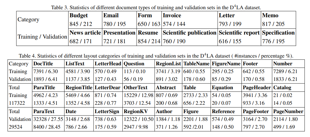 - D4LAデータセットの構築:既存の手法は科学論文に寄っていたが、それをもう少しデータのバリエーション増やした。キャプションやリストといった細かなアノテーションもつけている