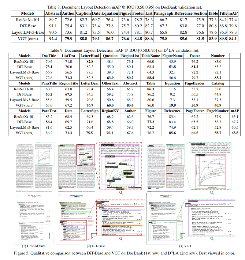 PubLayNet、DocBank、そして提案データセットD4LAを用いて定量評価を行い、平均平均適合率(mAP)でSOTAを達成した。定性評価では、図表内のテキストを誤って段落と認識するといった誤りが、VGTによって修正される例を示し、2D言語モデリングの有効性を実証した。